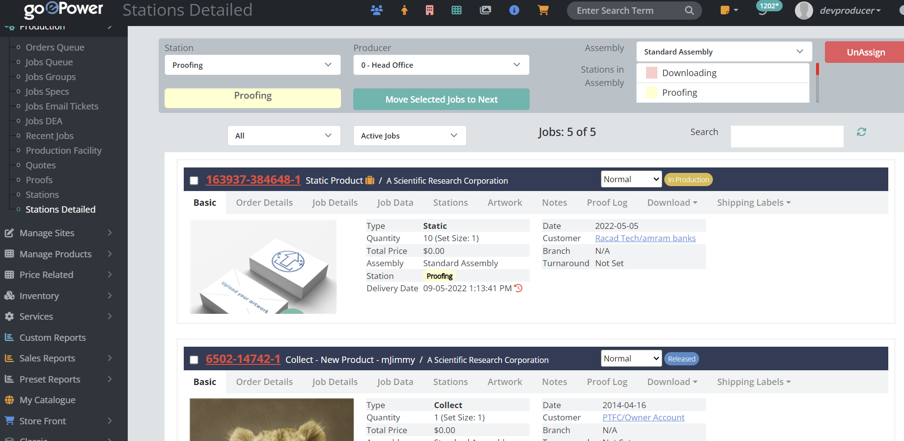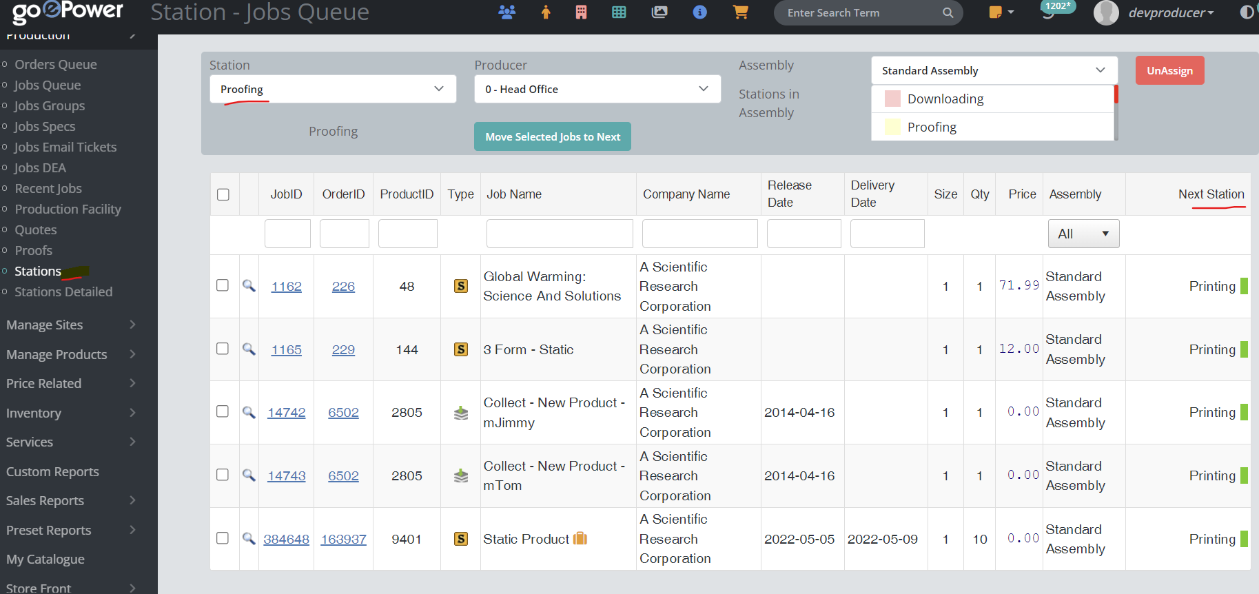Stations allows the producer to manage the individual parts/tasks (we call them stations) of a job. As well a producer can as assign different tasks/stations to different employees. When they only the stations that pertain to him. When updating a task the job will be moved to the next station. In the image below the producer is looking at all the jobs in a specific station. From this page you can update multiple jobs at a time and move them to the next station. Notice on the right side is the Next Station in the Que for that job.