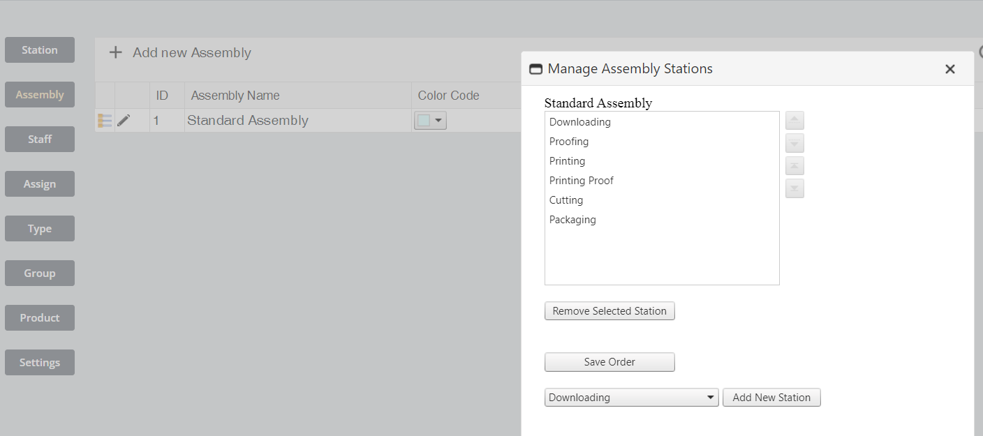Assembly: Each Assembly has a Name and Color Code. A set of Stations are to be associated with each Assembly, the order of these stations is important as it will control the Move to Next station action. First create your assembly name. Then click on the icon to the left of that new assembly name you just created and select the relevant stations. When all the stations are inserted click on the save button.