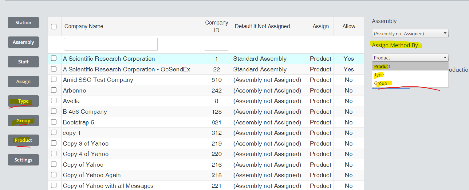 i. Assigning method can be set by Product, Type or Group. You can set how you want to link an assembly to a product. How you set up the products on the Assign page will dictate how you set up the products on the left side. Meaning if you set the assembly by Type then on the left side click on Type then click on the product type and select the assembly desired.
