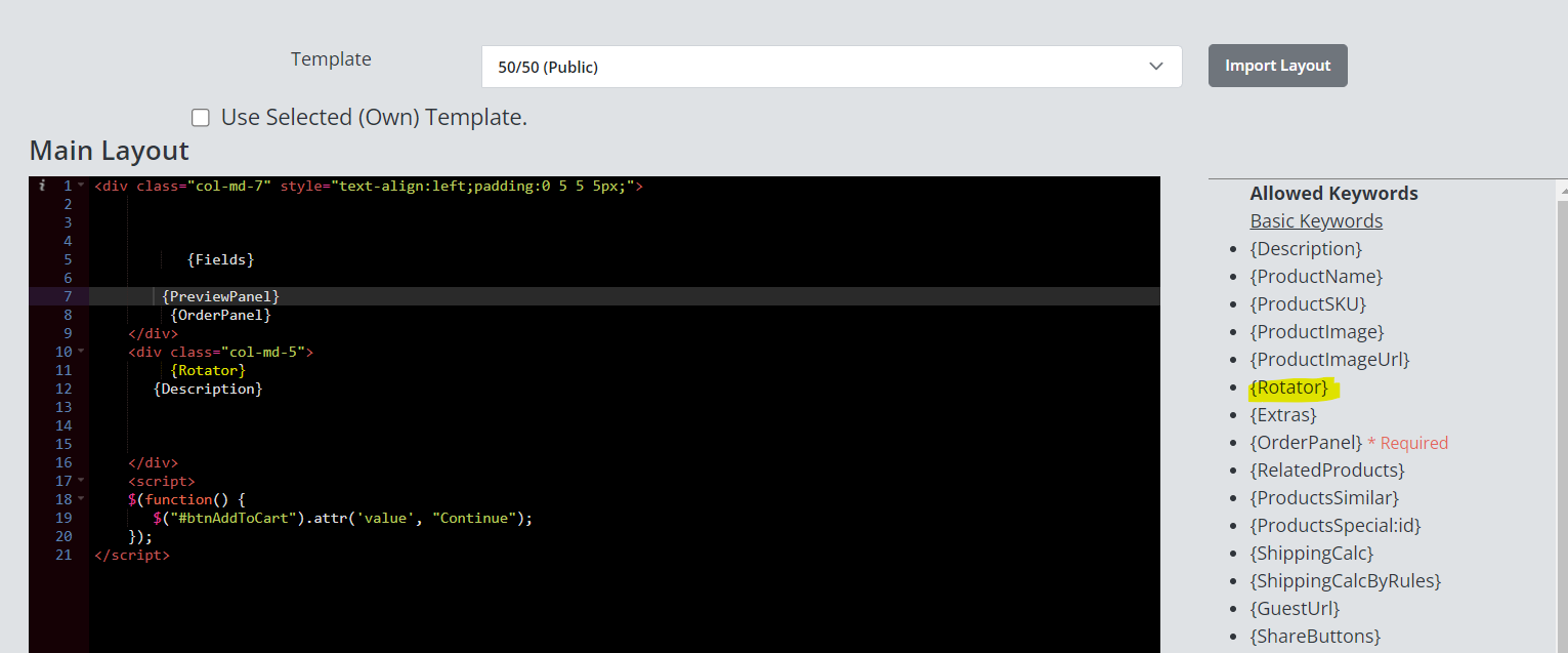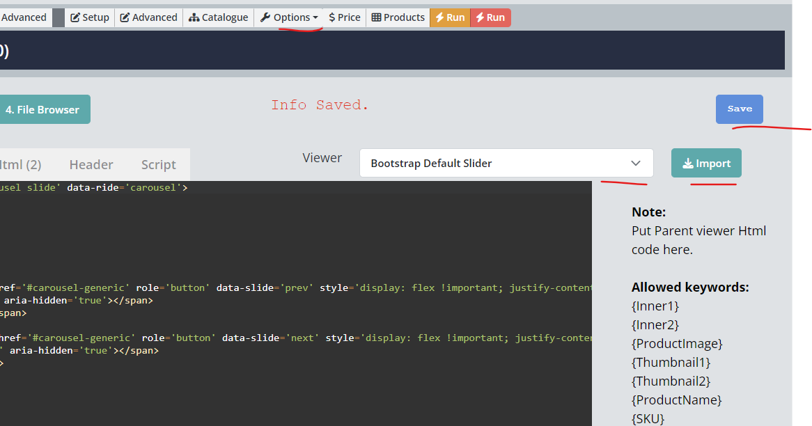 For example, if you import Boostrap Default Slider there is no extra Header or Script text needed. Just the HTML Body can be manipulated. if you import a different Viewer most likely there will be an extra Header and Script tag. You can use the Script section to change certain skins or speeds etc... DON'T FORGET TO CLICK ON SAVE.