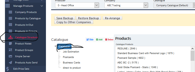 To create the catalogue structure for a company click Manage Products>Catalogue Structure.