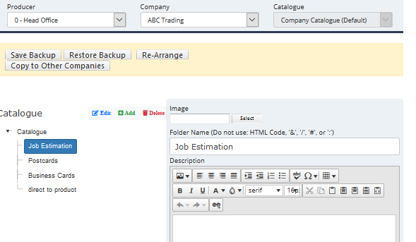 •Note there are 2 ways to place a product into the catalogue. Here you can put a product from any company into a category, alternatively you can add a product to the catalogue after when you create the product by clicking the catalogue button on the product setup page.