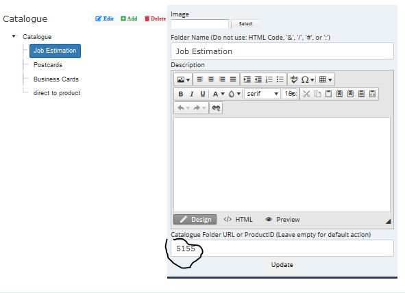 If a product is to run automatically when a folder is clicked type the product ID into the Catalogue folder url OR Product ID section