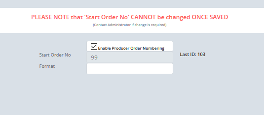 Tick Enable Producer order numbering and type your starting number. Note that Starting number CANNOT be changed once set