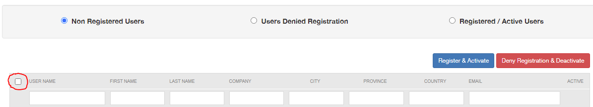 There are 2 buttons ‘Register & Activate’ and ‘Deny Registration and Deactivate’. All existing users will appear as Non Registered. You will most likely want to do a one-time Register & Activate. You can select all users by using the checkbox at the top left.