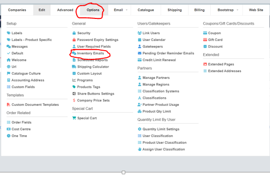 To send emails when inventory is adjusted, go to the company > Options > Inventory Emails.