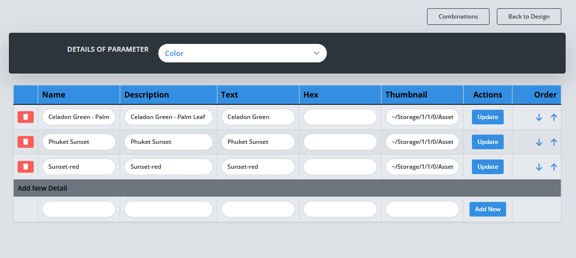Note: Adding a new parameter resets all existing combinations, so you’ll need to re-enter them. To simplify this process, a dedicated backend page allows you to manage combination details more efficiently in bulk.