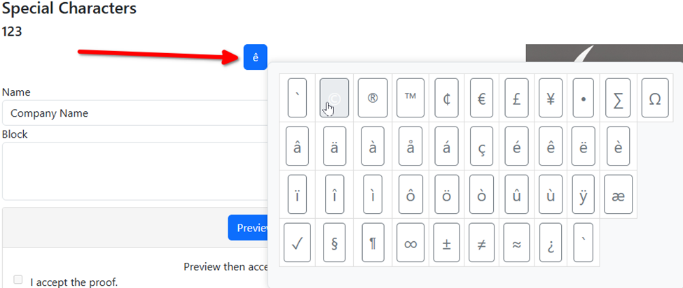 This keyword displays a button at the top of input fields. To insert a special character, place the cursor at the desired position within the input box and click the button. A popup will appear, showing a list of characters to choose from. Simply click on a character, and it will be inserted at your cursor’s location.